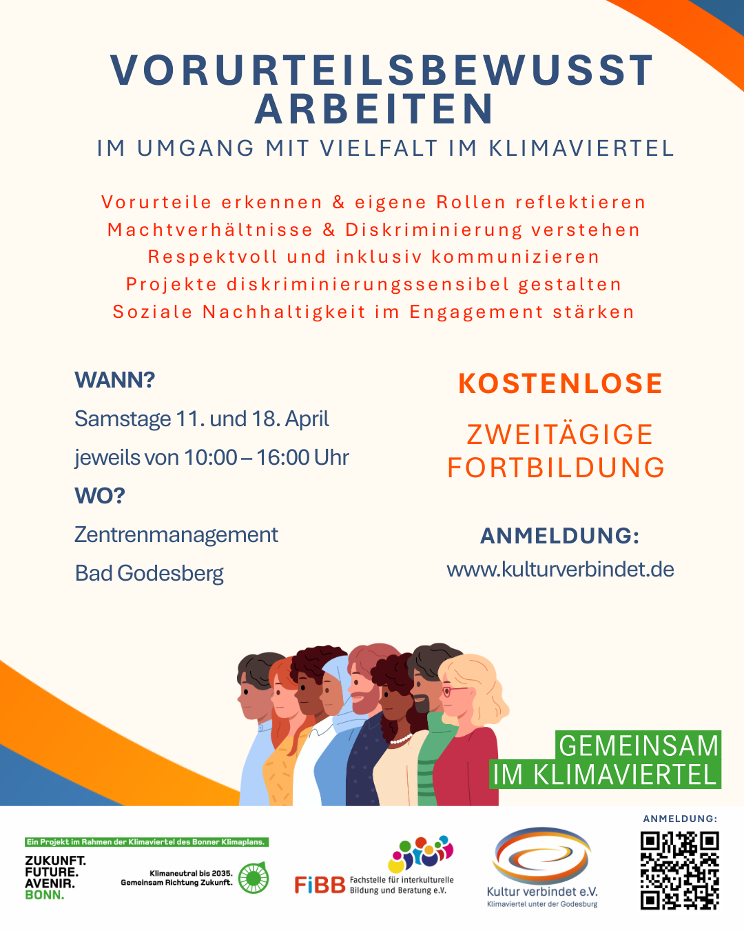 Am 11. und 18. April 2026 von 10:00 bis 16:00 Uhr im Zentrenmanagement Bad Godesberg lernst du Grundlagen der vorurteilsbewussten Bildungsarbeit – die Teilnahme ist kostenlos.