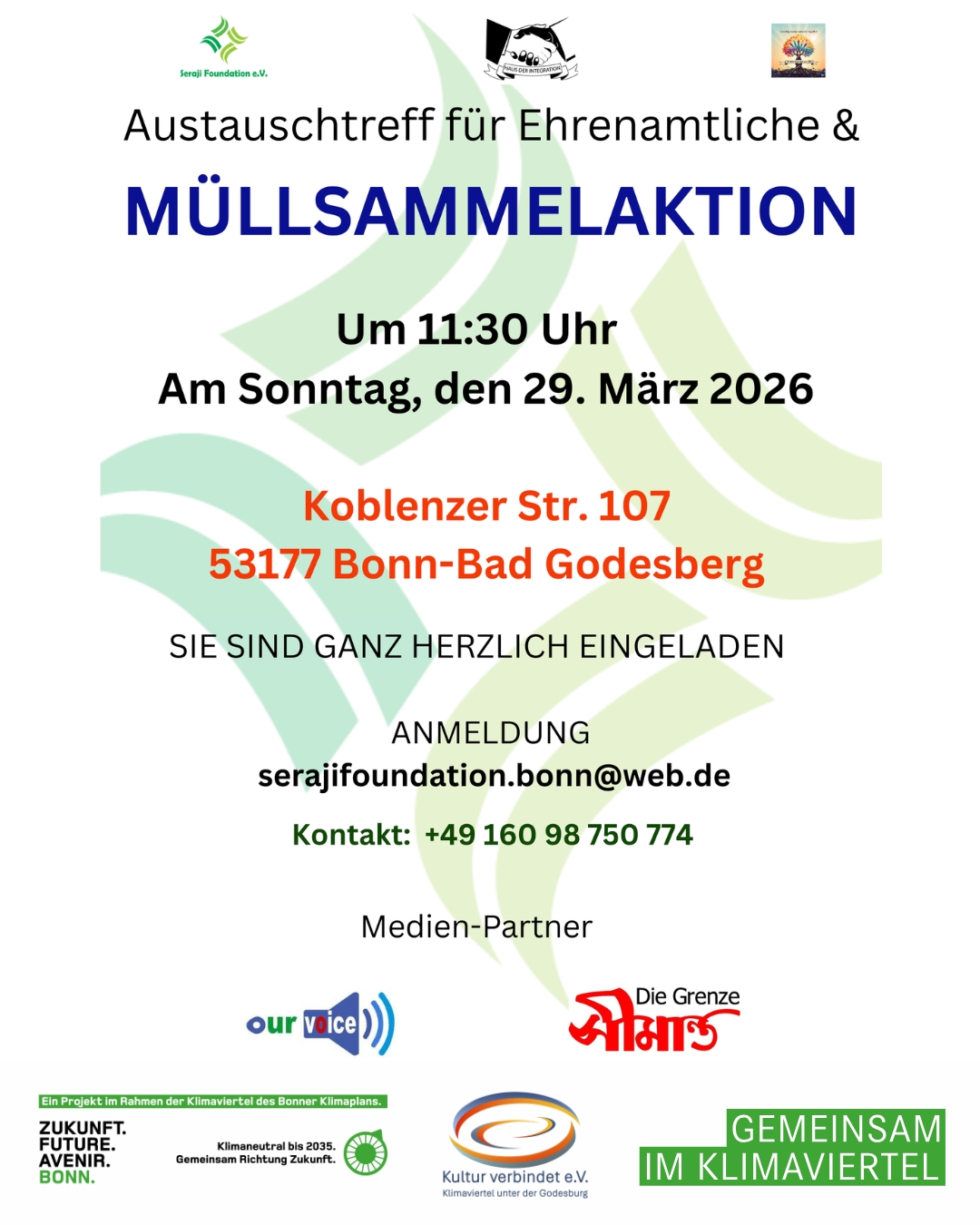 Am Sonntag, den 29.03.2026, findet ab 11:30 Uhr eine Müllsammelaktion in Bonn-Bad Godesberg statt. Treffpunkt ist die Koblenzer Str. 107.