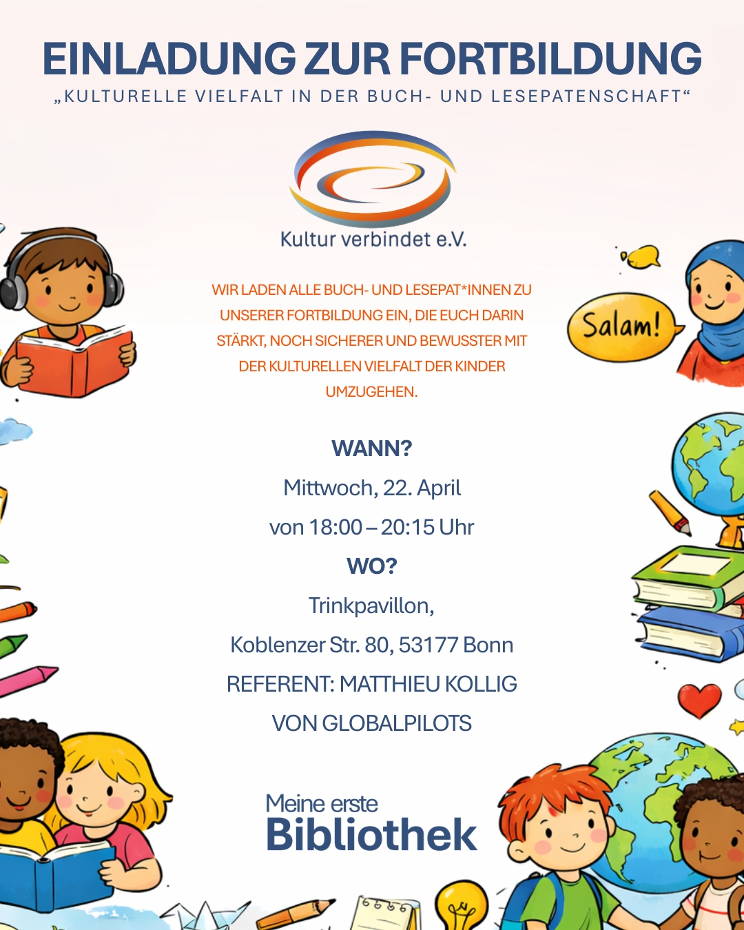 Am Mittwoch, den 22. April 2026, von 18:00–20:15 Uhr findet im Trinkpavillon in Bonn eine Fortbildung für Buch- und Lesepat*innen statt, die dabei unterstützt, sicherer und bewusster mit kultureller Vielfalt in der Arbeit mit Kindern umzugehen.