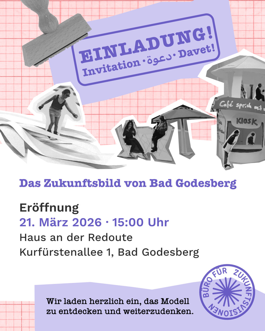 Am 21. März 2026 um 15:00 Uhr wird im Haus an der Redoute in Bonn Bad Godesberg das gemeinsam entwickelte Zukunftsbild der Kurfürstenzeile eröffnet und anschließend vom 21. bis 29. März (Mi–So, 14–18 Uhr) öffentlich ausgestellt.