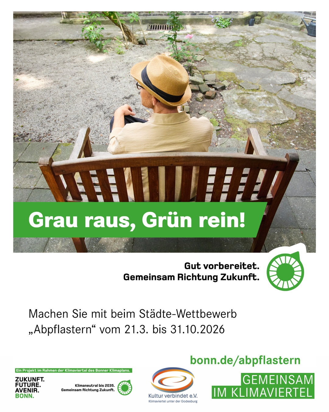Zwischen dem 21. März und 31. Oktober 2026 werden in Bonn versiegelte Flächen entsiegelt und begrünt. Mitmachen können alle, die ihre Projekte auf Abpflastern.de eintragen.