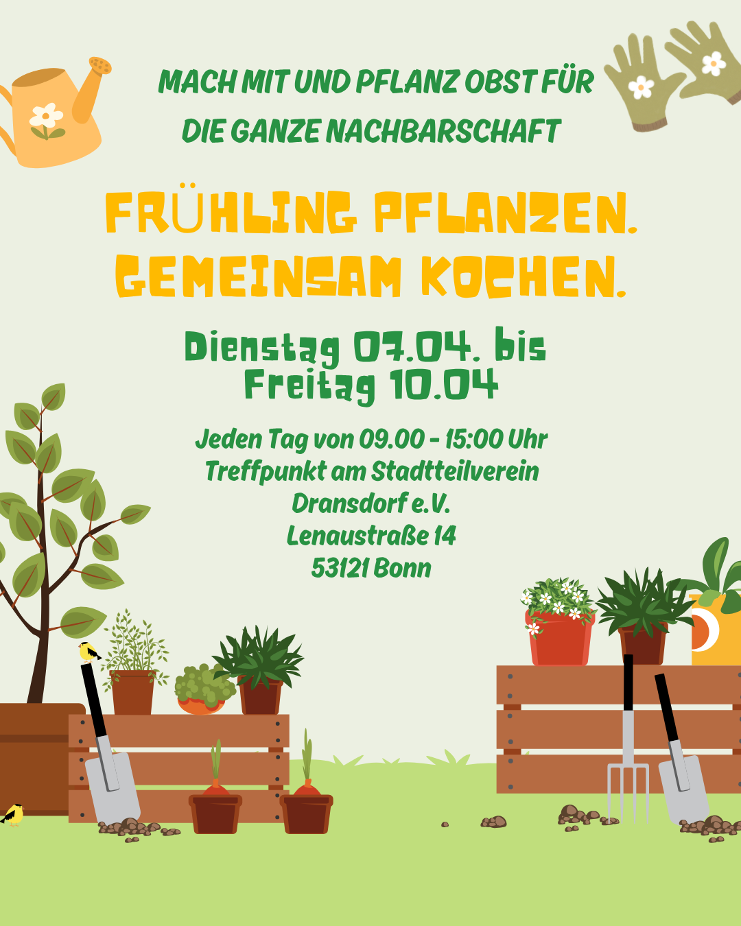 In der zweiten Ferienwoche (07.04 - 10.04.) pflanzen wir mit Kindern aus Dransdorf essbare Obstbäume und Beerensträucher und kochen zusammen. Der Abschluss ist ein gemeinsames kleines Frühlingsfest inkl. Theateraufführung am Freitag.
