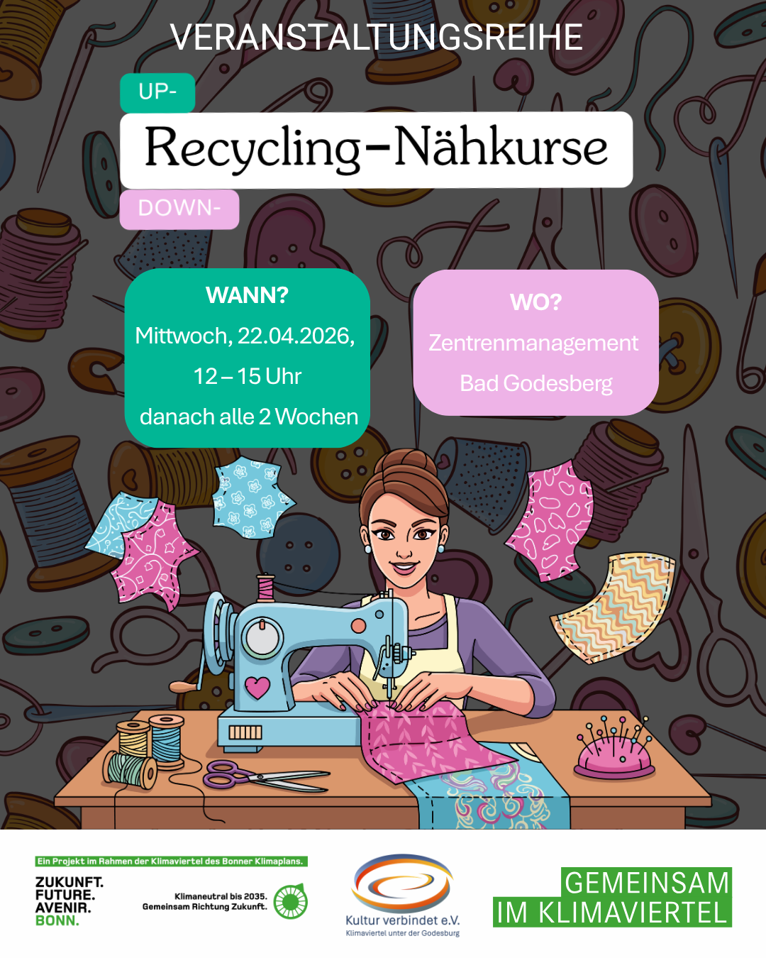 Ab 22.04.2026 finden alle zwei Wochen mittwochs von 12:00–15:00 Uhr kostenlose offene Up-, Down- und Recycling-Nähkurse im Zentrenmanagement Bad Godesberg statt.