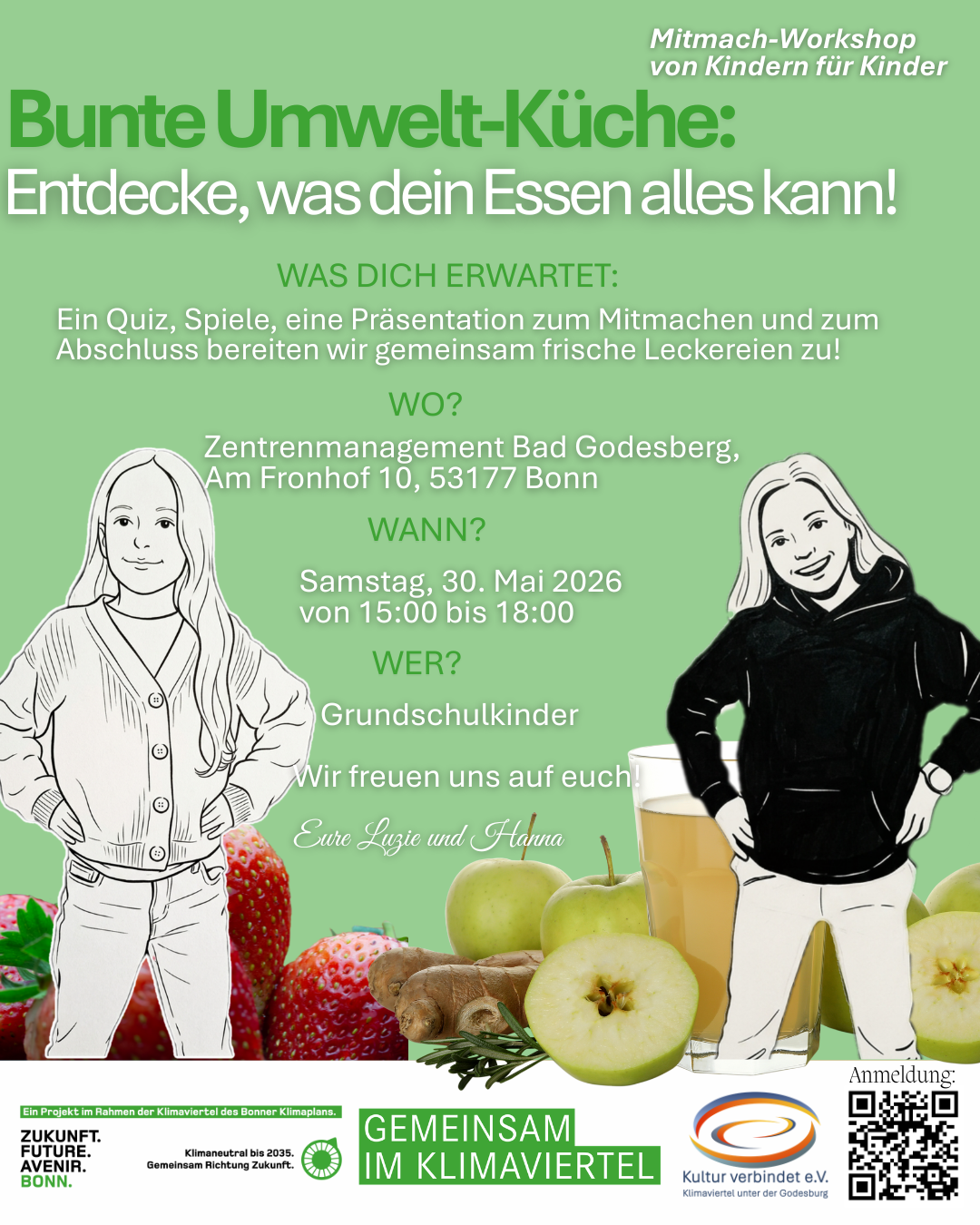 Samstag, 30. Mai 2026 von 15:00–18:00 Uhr im Zentrenmanagement Bad Godesberg. Ein Kinder-Mitmach-Workshop rund um Umwelt, Ernährung und regionales Essen mit Spielen, Quiz und gemeinsamer Zubereitung kleiner Speisen.