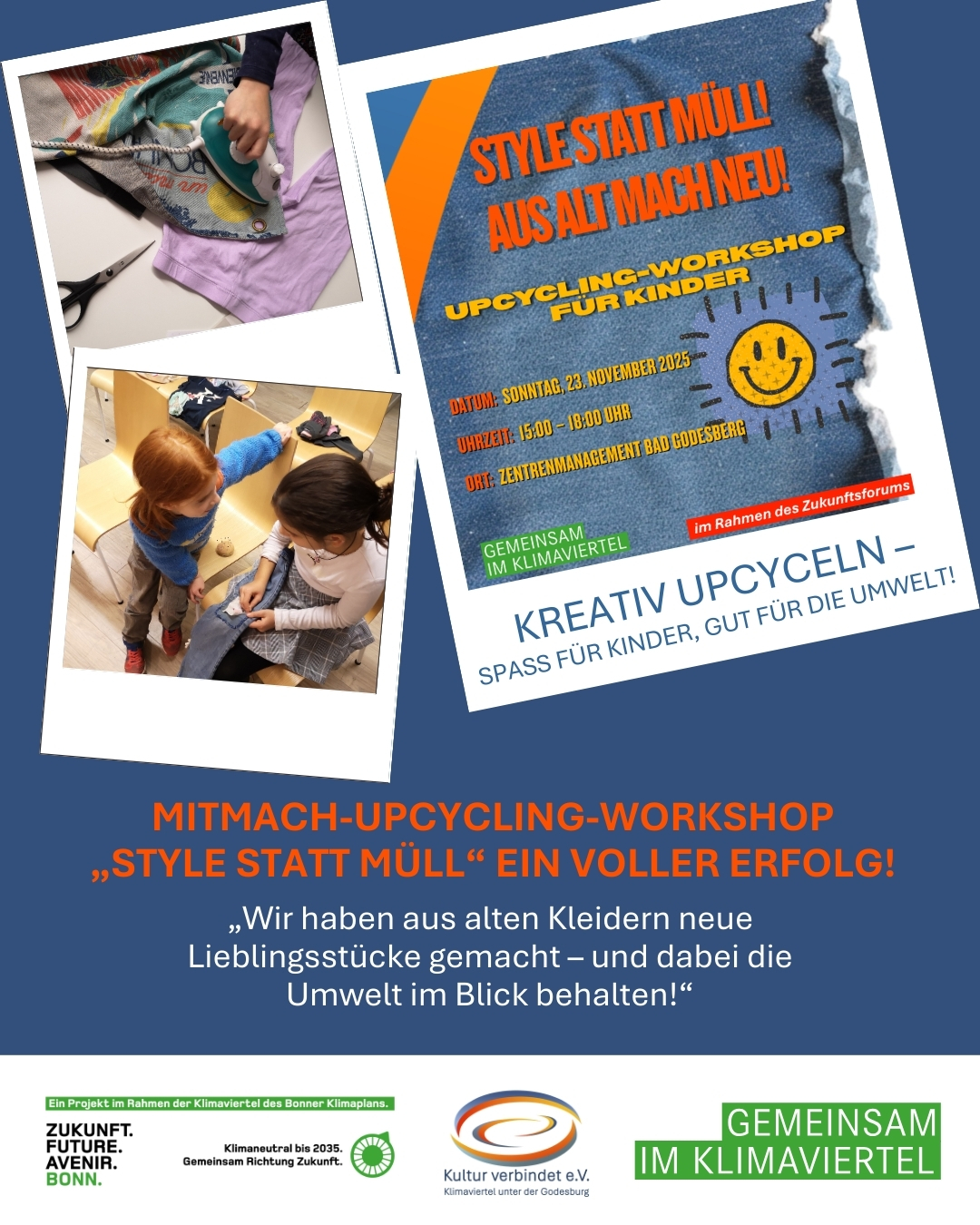 Am 23. November gestalteten Grundschulkinder in Bad Godesberg beim Upcycling-Workshop „Style statt Müll!“ aus alten Kleidungsstücken neue Einzelstücke und lernten dabei spielerisch über Nachhaltigkeit.