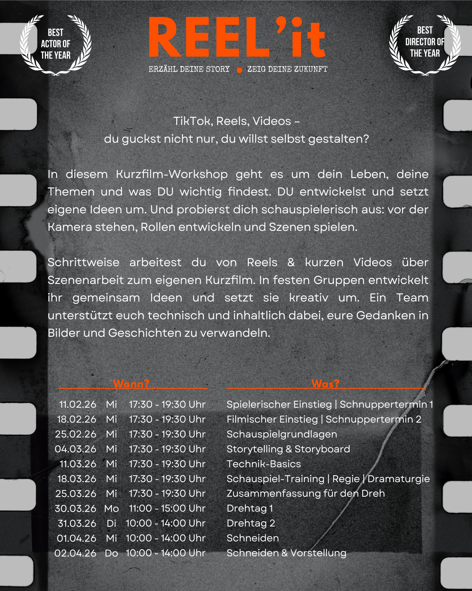 In diesem Kurzfilm-Workshop setzen sich Jugendliche zwischen 14 – 18 Jahre alt kreativ mit ihrer eigenen Lebensrealität und ihren Zukunftsvisionen auseinander. Sie entwickeln eigene Ideen, erzählen ihre Geschichten und setzen diese gemeinsam filmisch um – von kurzen Clips und Szenenarbeit bis hin zum eigenen Kurzfilm.
