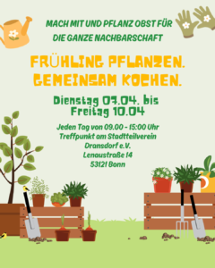 Die Kinder helfen bei der Vorbereitung und beim Aufbau und gestalten das Fest aktiv mit. Um 11 Uhr starten wir mit guten Wetter und Laune. Dabei geht es natürlich darum gemeinsam mit Essen und Trinken den Frühling zu begrüßen aber vor allem wollen wir der Nachbarschaft unsere gepflanzten Obstbäume und Beerensträucher präsentieren!